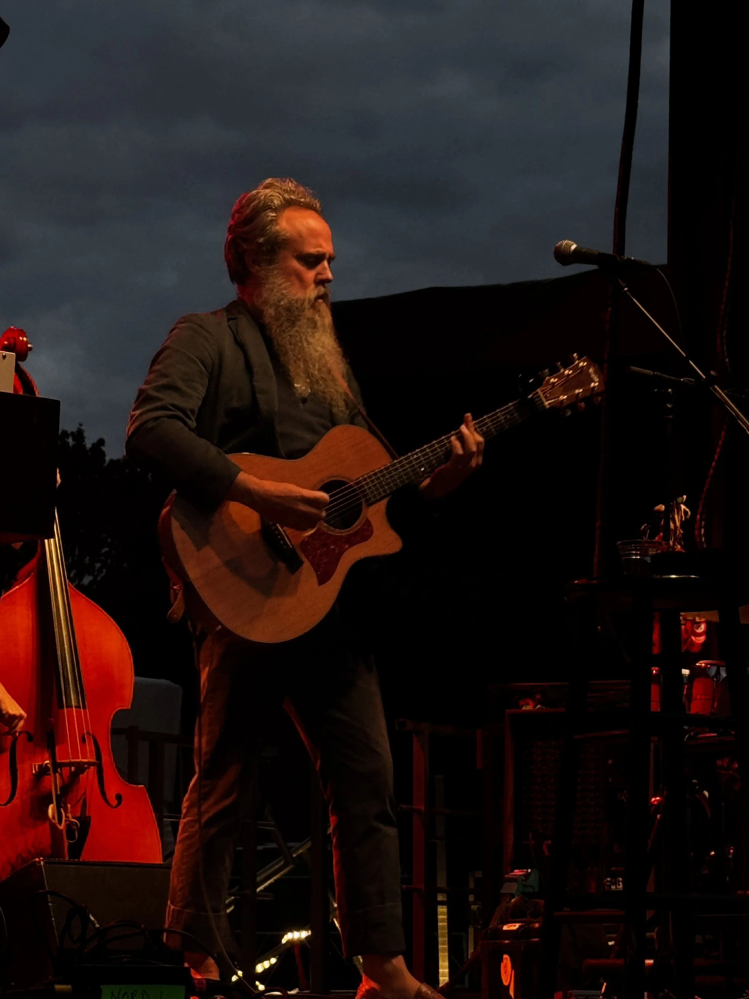 The grand finale for the day is headliner Samuel Ervin Beam, aka Iron & Wine. He and his band open, under fiery red lighting, with “On Your Wings” from his 2004 album, the one that made me a fan, Our Endless Numbered Days. The original is more gentle and whispered, but this rendition’s got a biting, staccato edge to it. Each phrase is angry, impatient, and demanding: “God, give us love in the time that we have / God, there are guns growing out of our bones / God, every road takes us farther from home.”